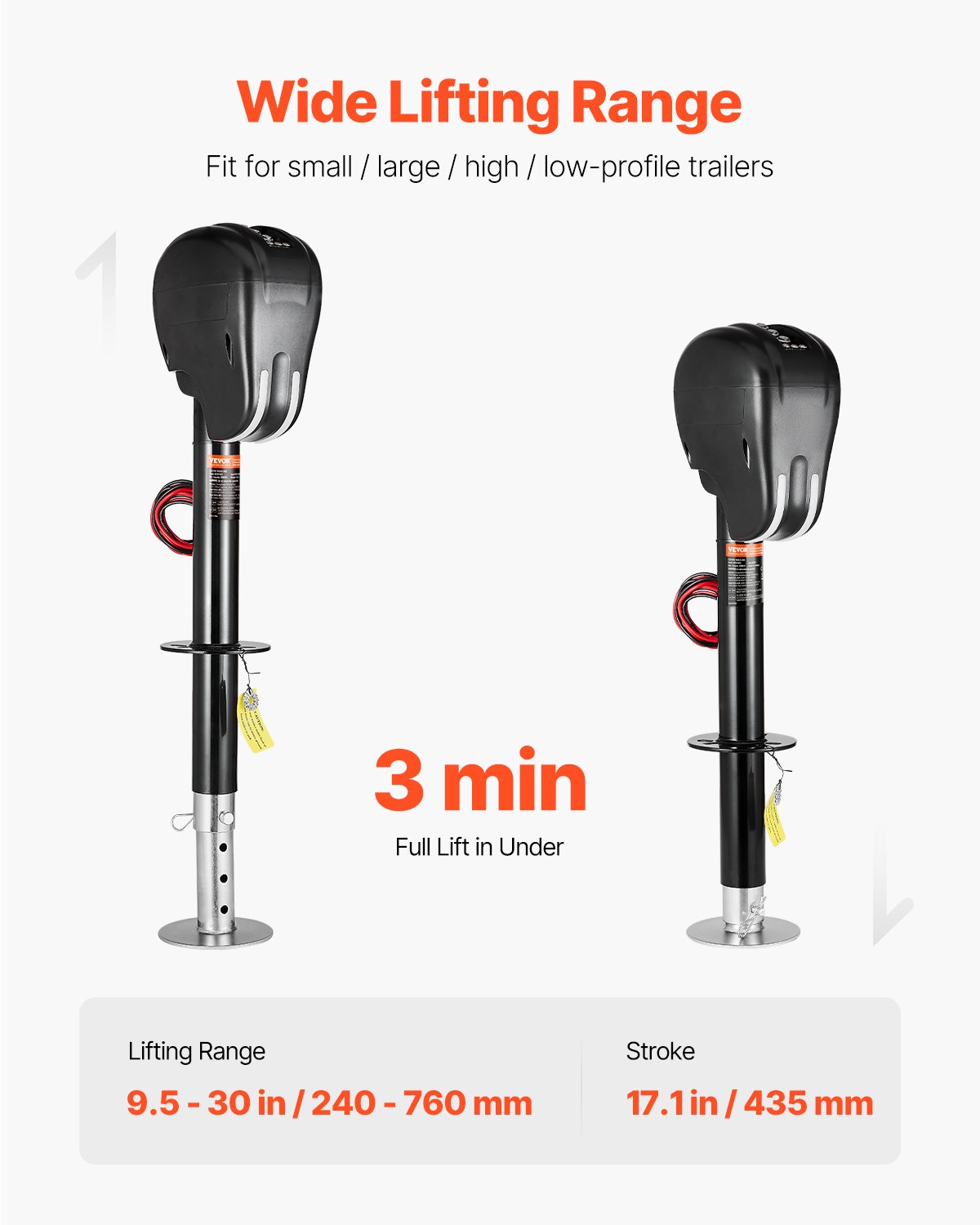 - Heavy-Duty Load Capacity: The VEVOR electric trailer jack boasts an impressive lifting capacity of 3500 lbs and a lifting range of 9.5 to 30 inches.